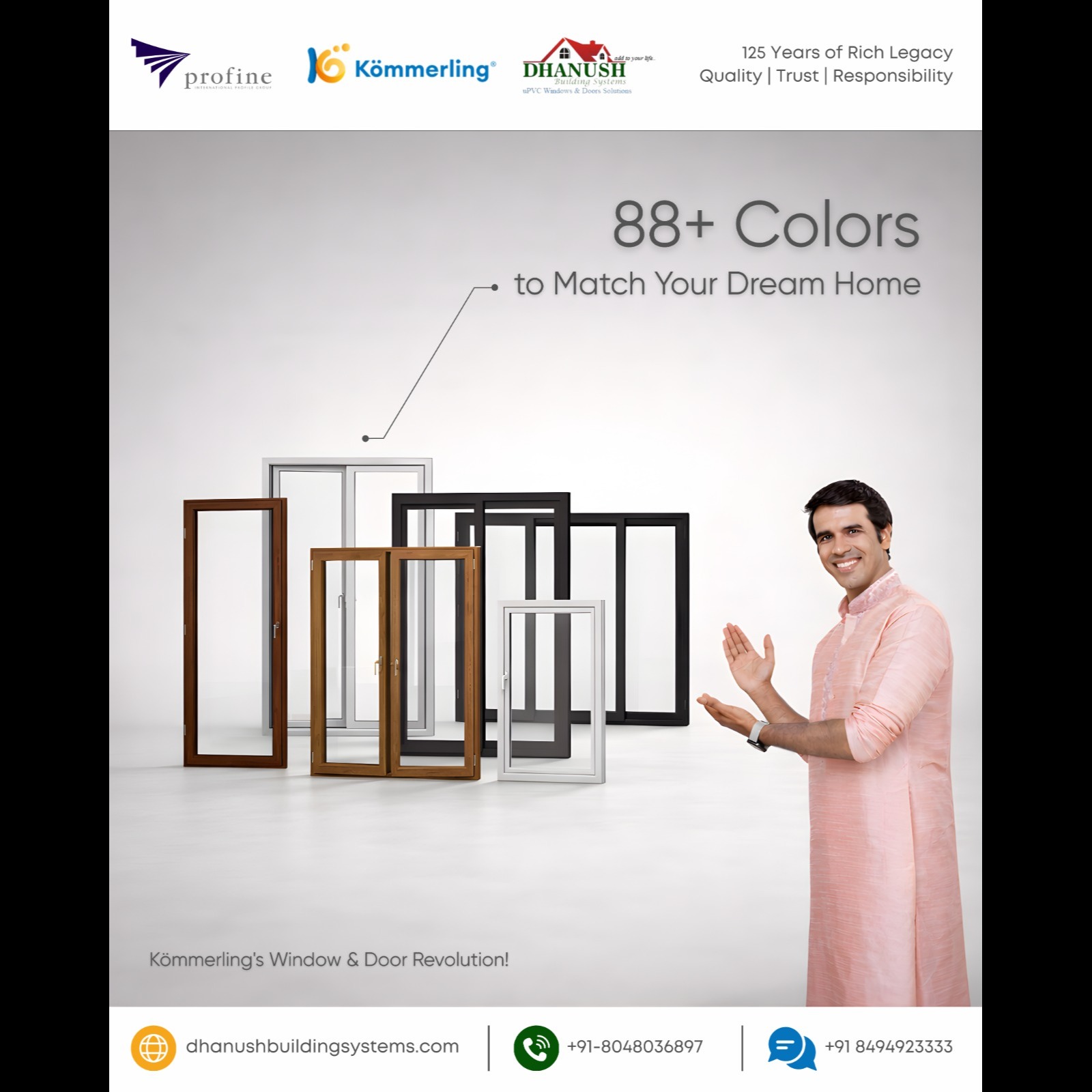 Endless Style Choices: Inside-Out Color Magic for Modern Living Personalize perfection with Kömmerling's vast palette of over 88 laminate variants, woodgrains, metallics, solids, and premium AcrylColor finishes like classic white, trendy Anthracite Grey, Black Ultima, or natural timber tones. Mix inside-out colors for dual-tone luxury that complements Bangalore interiors while braving exteriors. Your Authorized Partner, Dhanush Building Systems, brings this German-engineered customization to elevate homes with durable, stunning aesthetics. 88+ Laminate Variants: Woodgrains for warmth, metallics for edge, solids for boldness, match any modern vibe. Dual-Sided Freedom: Different colors inside (cozy oak) and out (sleek anthracite), true personalization. Trendy & Timeless Shades: Anthracite Grey, Black Ultima, AcrylColor gloss, fade-proof for India's climate. Premium Durability: Scratch-resistant laminates ensure color pops for 20+ years without yellowing. Energy-Smart Design: Color options pair with insulated profiles, cutting AC bills by 30% in Bangalore heat. Note: Customize your windows and doors today! Contact Dhanush Building Systems, Kömmerling Authorized Partner in Bengaluru, for free color samples, home consultations, and instant quotes. Your style, your way, transform now!