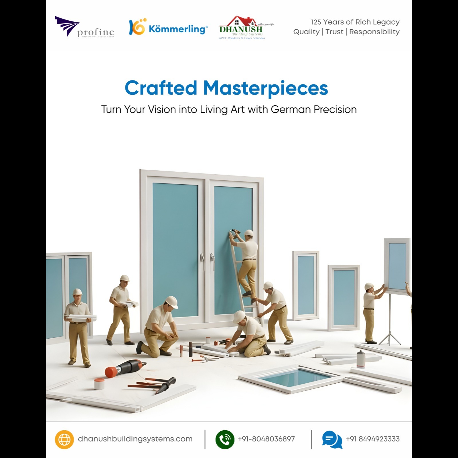 Crafted Masterpieces: Kömmerling uPVC Windows Transform Homes! Turn Your Vision into Living Art with German Precision Elevate your Bangalore home to gallery status with Kömmerling uPVC windows, precision-crafted by German engineering to fuse stunning aesthetics, superior insulation, and timeless durability into every frame. Authorized partner Dhanush Building Systems delivers these masterpiece windows that don't just protect, they inspire, turning ordinary spaces into extraordinary showcases of modern elegance and comfort. Artisan-Level Craftsmanship: Sleek profiles and flawless finishes create designer statement pieces. Thermal Masterpiece Performance: Triple-layer insulation slashes AC bills by 40% year-round. Custom Aesthetic Perfection: 88+ colors, woodgrain textures match your interior vision flawlessly. Monsoon-Proof Durability: uPVC resists warping, corrosion, 50-year beauty guarantee. Soundproof Sanctuary: Blocks 90% external noise for peaceful home galleries. Note: Make your home a masterpiece today! Contact Dhanush Building Systems, Kömmerling Authorized Partner in Bengaluru, for free design consultations, color matching, and custom uPVC installations. Your dream windows await. craft now!