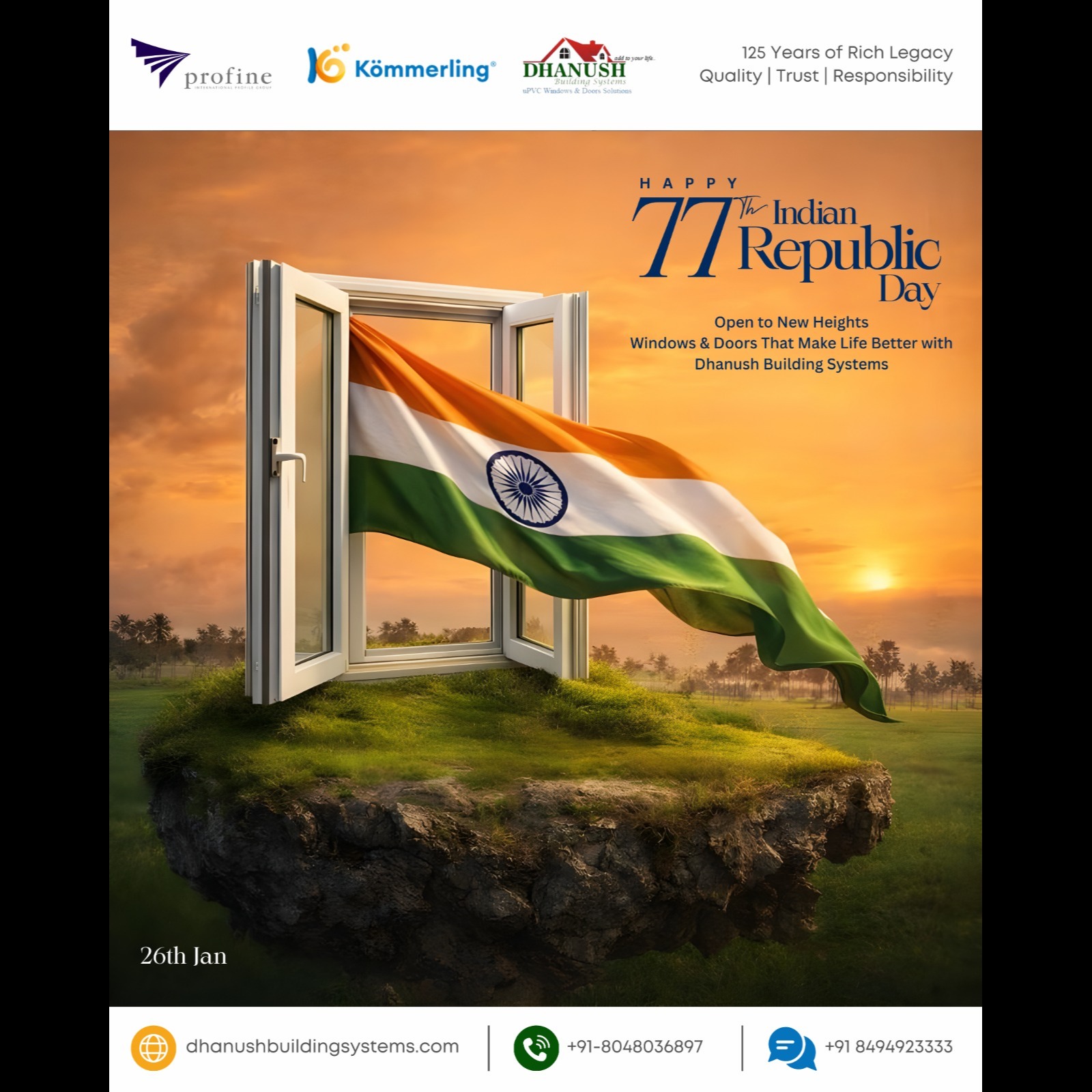 Open to New Heights: Dhanush's Republic Day Cheers Windows & Doors That Make Life Better On January 26, 2026, join the 77th Republic Day fun, the same spirit that started with our Constitution back in 1950. Dhanush Building Systems brings you top Kömmerling uPVC and Aluminium windows & doors that save energy, last forever, and look super stylish for your home or office. Think cool rooms in summer (cut bills by 35%!), no leaks in rain, and designs that match your vibe, perfect for Bengaluru homes or Karnataka shops. Easy to fit, backed by strong promises, and loved by families who want comfort without worry. Your Republic Day Deal: Order by January 31, 2026, to receive bonus discounts on Kömmerling profiles and complimentary design consultations. Open the door to enduring excellence with Dhanush, where every view inspires progress. Jai Hind!